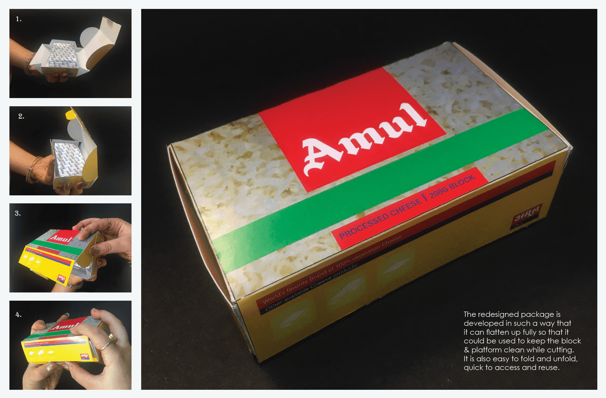 The redesigned Amul Cheese Packaging project focuses on enhancing the usability and storage convenience of Amul’s 200g Processed Cheese Block. Developed during a Packaging Design course at Nirma University, this project addresses common consumer issues, ensuring the cheese remains fresh and easy to access.
