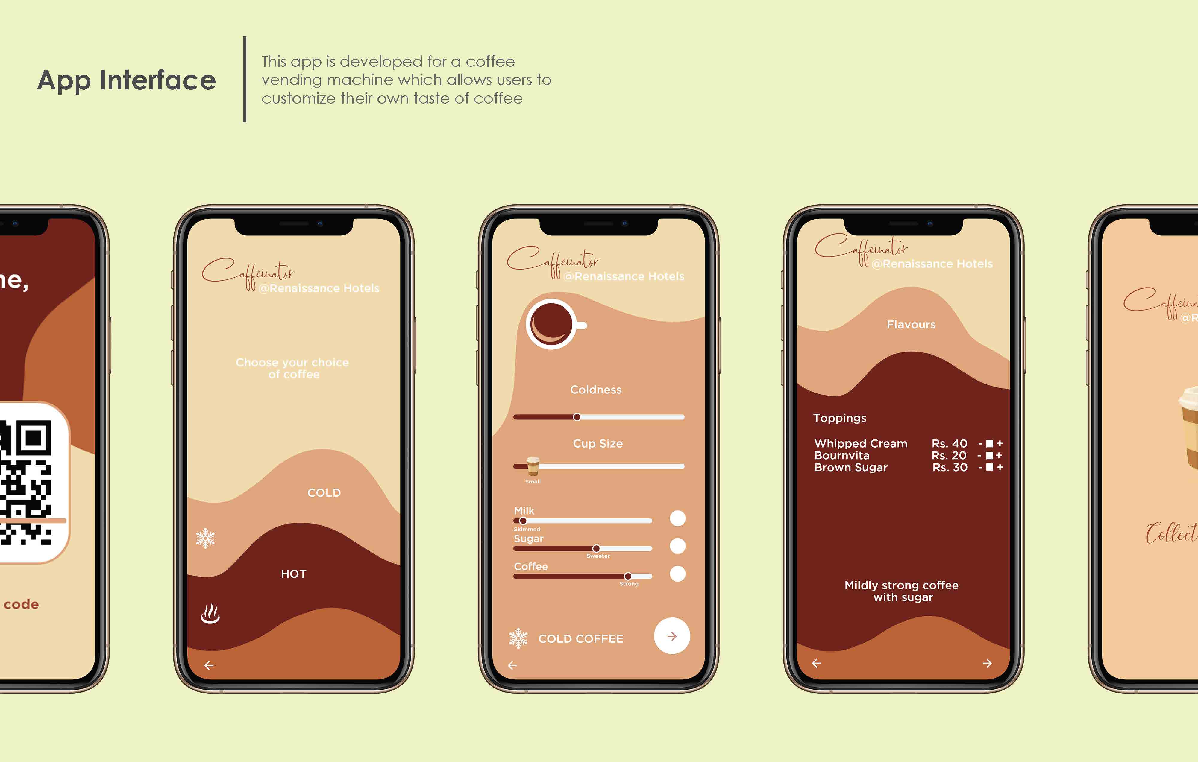 Users log into the app, scan a QR code, and customize coffee parameters (strength, temperature, sweetness, milk content)